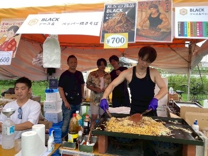 本年度は、荒井部長が考案したオリジナルレシピであるブラックソース焼きそばと生ビールとソフトドリンクの3品を販売いたしました。